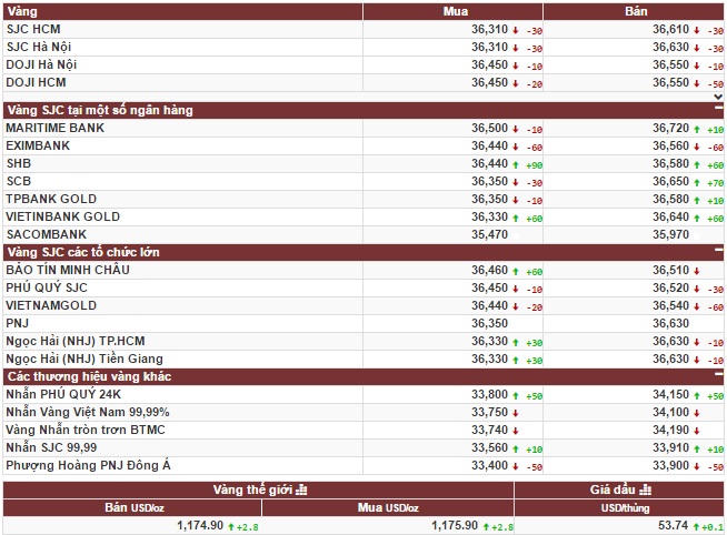 Tại Công ty SJC, giá vàng niêm yết chiều mua vào là 35,35 triệu đồng/lượng, ở chiều bán ra có mức giá là 36,67 triệu đồng/lượng. Tại thị trường TP.HCM, chiều bán ra niêm yết ở mức giá 36,65 triệu đồng/lượng.