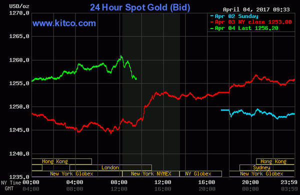 Tới đầu giờ sáng 5/4 (giờ Việt Nam), giá vàng thế giới giao ngay đứng ở mức 1.257,1 USD/ounce. Giá vàng giao tháng 6 trên sàn Comex New York tăng 8,6 USD lên 1.262,6 USD/ounce.