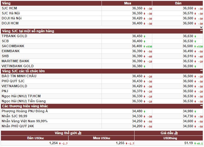 Cùng thời điểm, Công ty Vàng bạc đá quý Sài Gòn niêm yết giá mua - bán vàng miếng SJC ở ngưỡng 36,37 - 36,57 triệu đồng/lượng, tăng 90.000 đồng/lượng cả 2 chiều mua – bán so với phiên trước. Chênh lệch giá mua thấp hơn giá bán là 200.000 đồng/lượng.