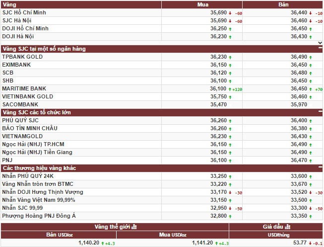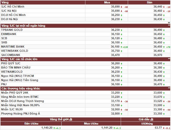 Tập Đoàn Vàng bạc đá quý DOJI niêm yết giá vàng SJC ở mức: 36,23 triệu đồng/lượng (mua vào) và 36,43 triệu đồng/lượng (bán ra). Công ty vàng bạc Bảo Tín Minh Châu niêm yết giá vàng SJC niêm yết giá vàng ở mức: 36,26 triệu đồng/lượng (mua) và 36,38 triệu đồng/lượng (bán).