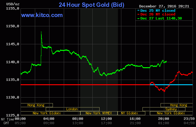 Tính tới đầu giờ sáng 28/12 (giờ Việt Nam), giá vàng thế giới giao ngay đứng ở mức 1.138,3 USD/ounce, tăng khoảng 10 USD so với phiên liền trước. Giá vàng đêm qua trên thị trường New York có lúc lên gần 1.150 USD/ounce. Giá vàng giao tháng 2 trên sàn Comex New York tăng 4,6 USD lên 1.138,2 USD/ounce.
