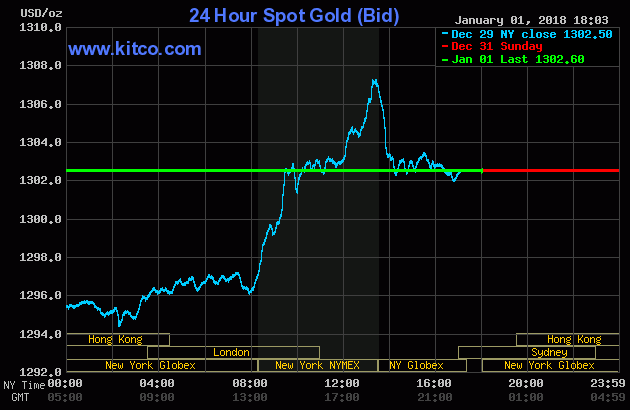 Giá vàng thế giới trên sàn Kitco mở phiên năm mới với con số khá ấn tượng 1302,8 - 1303,8 USD/ounce (mua vào - bán ra). Vàng vẫn ở trên mức cao trong những phiên gần đây, tạo sự hứng khởi cho các nhà đầu tư ngay ngày đầu năm 2018