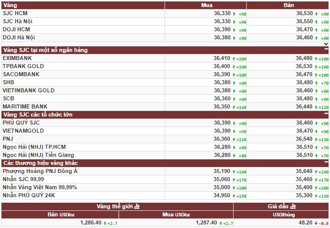 Giá vàng miếng SJC ở Tập đoàn vàng bạc đá quý Phú Quý đang niêm yết ở mức 36,39- 36,46 triệu đồng/lượng (mua vào - bán ra), tăng 90.000 đồng/lượng ở cả 2 chiều mua vào và bán ra so với mức giá cuối phiên ngày 10/8, chênh lệch mua vào và bán ra là 70.000 đồng.