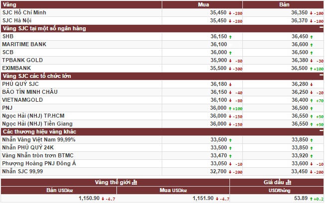 Giá vàng SJC của Công ty vàng bạc đá quý Sài Gòn được niêm yết ở mức 35,45 - 36,37 triệu đồng/lượng (mua vào - bán ra), quay đầu giảm 90 nghìn đồng/lượng ở chiều mua vào và giảm 150 nghìn đồng/lượng ở chiều bán ra so với phiên hôm qua.