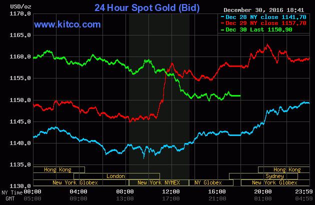Sáng nay 7:00 theo giờ Việt Nam, giá vàng giao ngay trên sàn Kitco đứng tại 1.150.9USD/oz, giảm 0,58% so với chốt phiên trước. Giá vàng giao ngay tháng hai trên Comex của New đạt mức 1.164,25 USD/ounce, mức cao nhất kể từ tháng 9 năm nay.