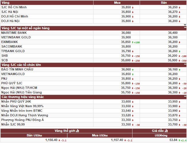 Tại Công ty SJC, giá vàng niêm yết chiều mua vào là 35,85 triệu đồng/lượng, ở chiều bán ra có mức giá là 36,27 triệu đồng/lượng. Tại thị trường TP.HCM, chiều bán ra niêm yết ở mức giá 36,25 triệu đồng/lượng.