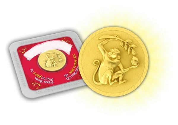| Một đồng tiền vàng in hình chú khỉ hái quả được DN đưa ra chờ đón ngày Vía Thần Tài năm Bính Thân. |
