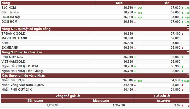 Cụ thể, giá vàng của doanh nghiệp tại TP.HCM đang được giao dịch ở mức 36,73 – 37 triệu đồng/lượng trong khi tại Hà Nội là 36,73-37,02 triệu đồng/lượng. Trong tuần trước, mỗi lượng vàng SJC tăng 70 nghìn đồng, tương đương 0,19% giá trị.