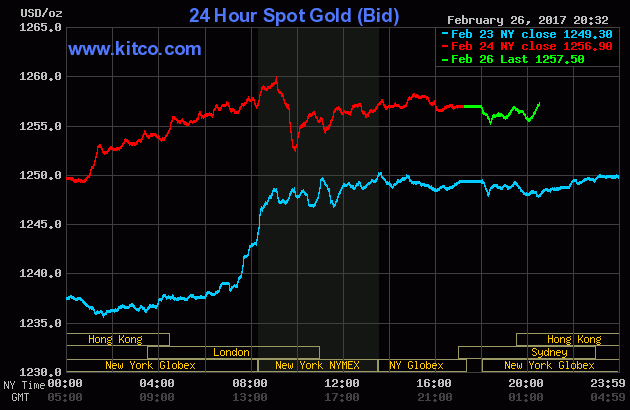 Giá vàng thế giới niêm yết trên sàn New York lúc 8 giờ (giờ Việt Nam) là 1.257,70 USD/ounce. Thị trường châu Á, giao dịch vàng trên sàn Thượng Hải niêm yết 1.248,49 USD/ounce.