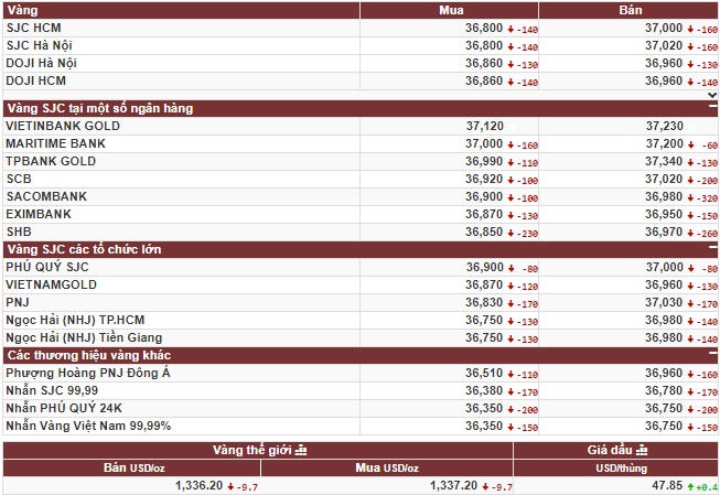 Tại Công ty SJC, giá vàng niêm yết chiều mua vào là 36,850 triệu đồng/lượng, ở chiều bán ra có mức giá là 37,07 triệu đồng/lượng. Tại thị trường TP.HCM, chiều bán ra niêm yết ở mức giá 37,05 triệu đồng/lượng.