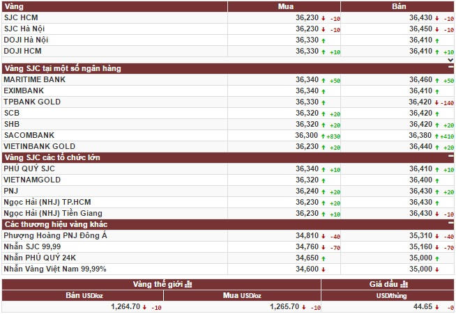Cùng thời điểm, giá vàng mua vào tại Tập đoàn DOJI đang là 36,32 triệu đồng/lượng, giá vàng bán ra là 36,40 triệu đồng/lượng, giảm 10.000 đồng/lượng so với chốt phiên chiều qua. Chênh lệch mua – bán là 80.000 đồng/lượng.