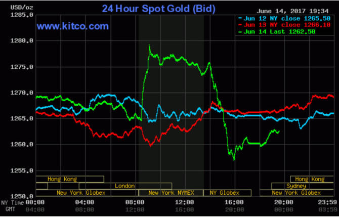 Giá vàng bất ngờ tăng hôm thứ Tư (14/6) sau chuỗi giảm kéo dài 5 phiên trước đó, trước khi Fed nâng lãi suất lần thứ hai trong vòng 3 tháng. Vàng giao tháng Tám chốt phiên tăng 7,30 USD, tương đương 0,6%, lên 1.275,90 USD/ounce, ngay trước thềm Fed thông báo nâng lãi suất.