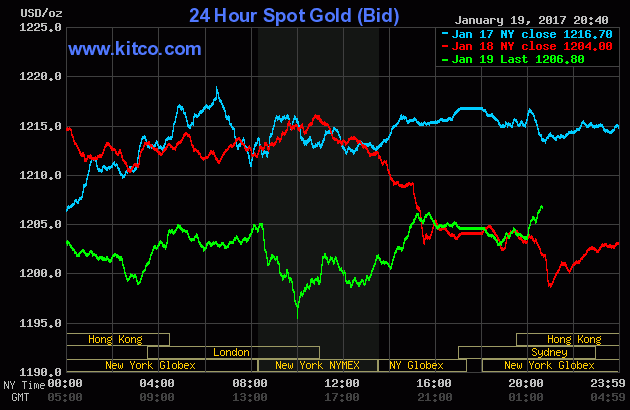 Sáng nay 7:00 theo giờ Việt Nam, giá vàng giao ngay trên sàn Kitco đứng tại 1.203,7USD/oz, giảm 0,02% so với chốt phiên trước. Giá vàng giao tháng 2 trên sàn Comex New York cũng giảm ở mức tương tự xuống 1.200 USD/ounce.