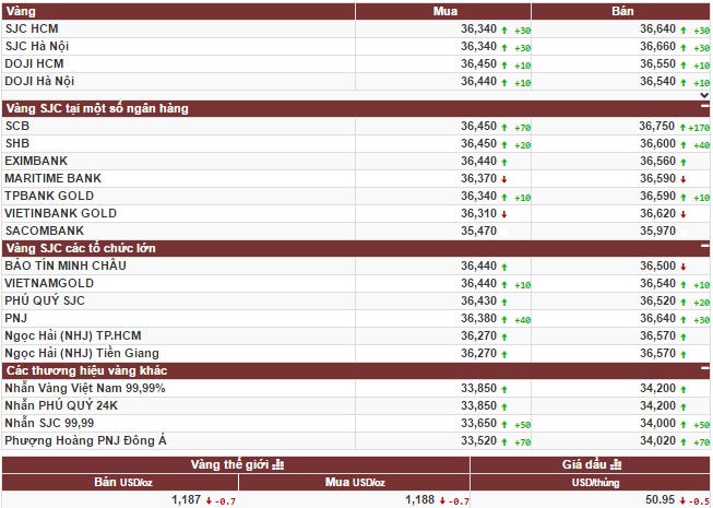 Công ty vàng bạc đá quý Sài Gòn niêm yết ở mức 36,34 triệu đồng/lượng (mua vào) và 36,66 triệu đồng/lượng (bán ra), tăng 30 ngàn đồng/lượng ở cả 2 chiều mua vào và bán ra so với cuối giờ chiều 10/1.