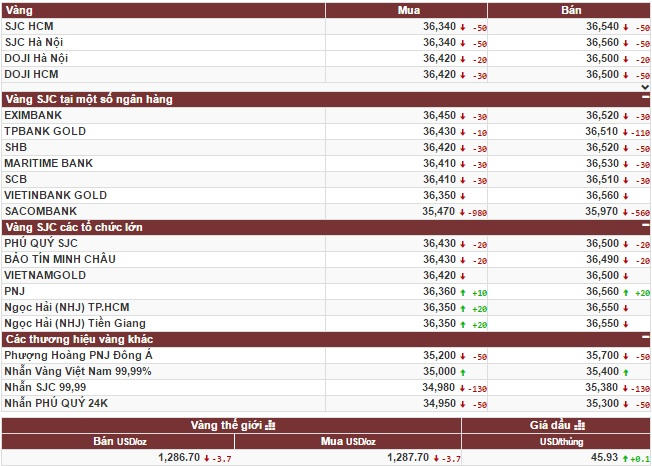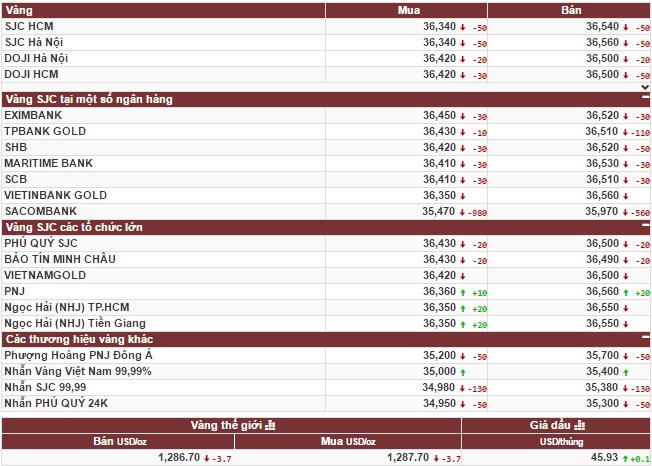 Cùng thời điểm, giá vàng DOJI ở thị trường Hà Nội mua vào là 36,42 triệu đồng/lượng, bán ra là 36,50 triệu đồng/lượng. Giá vàng đã giảm 20.000 đồng/lượng ở cả hai chiều mua và bán so với chốt phiên hôm qua. Chênh lệch giá mua – bán là 80.000 đồng/lượng.