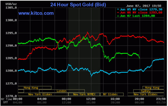 Ở thời điểm cập nhật lúc 7h00 sáng theo giờ Việt Nam, giá vàng giao ngay đang ở mức 1.284,80 USD/ounce, giảm so với mức chốt phiên hôm thứ Ba là 1.293,60 USD/ounce.