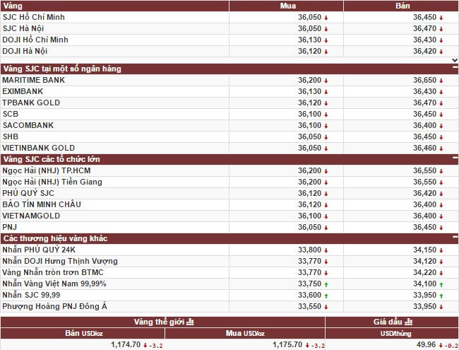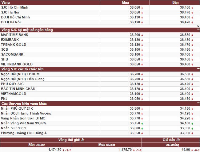 Cụ thể, tính tới cuối phiên giao dịch 7/12, Tập Đoàn Vàng bạc đá quý DOJI niêm yết giá vàng SJC ở mức: 36,12 triệu đồng/lượng (mua vào) và 36,42 triệu đồng/lượng (bán ra). Công ty vàng bạc đá quý Sài Gòn niêm yết vàng SJC ở mức: 36,05 triệu đồng/lượng (mua vào) và 36,47 triệu đồng/lượng (bán ra). Công ty vàng bạc Bảo Tín Minh Châu niêm yết giá vàng SJC niêm yết giá vàng ở mức: 36,12 triệu đồng/lượng (mua) và 36,40 triệu đồng/lượng (bán).