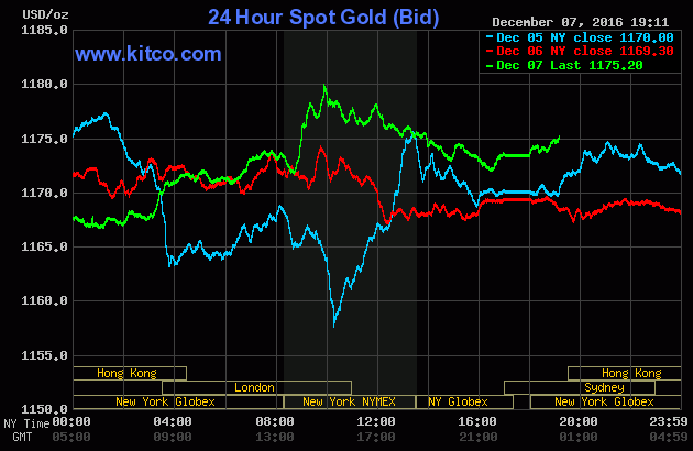 Giá vàng giao ngay chốt phiên ở mức 1.176,98 USD/oz, tăng 0,6%, trong khi giá vàng kỳ hạn giao tháng 2 của Hoa Kỳ tăng 9,70 USD niêm yết tại 1.179,80 USD.