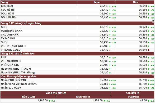 Khảo sát lúc 8h45 sáng nay (10/10), giá vàng miếng SJC tại Công ty TNHH MTV Vàng bạc đá quý Sài Gòn - SJC được niêm yết ở mức 36,45 - 36,65 triệu đồng/lượng (mua vào - bán ra); tăng tiếp 20 nghìn đồng/lượng ở cả hai chiều mua vào và bán ra so với giá khảo sát sáng qua.