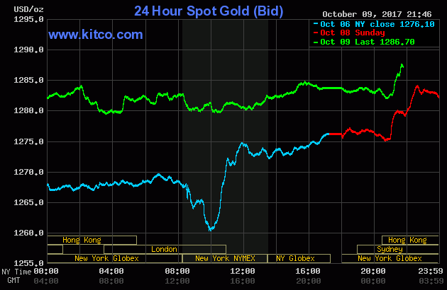 Tới đầu giờ sáng 10/10 (giờ Việt Nam), giá vàng thế giới giao ngay đứng ở mức 1.281,8 USD/ounce. Giá vàng giao tháng 12 trên sàn Comex New York đứng ở mức 1.283,5 USD/ounce.