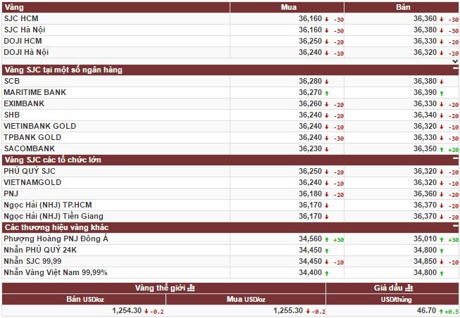 Công ty vàng bạc đá quý Sài Gòn niêm yết giá vàng SJC ở mức 36,16 triệu đồng/lượng (mua vào) và 36,38 triệu đồng/lượng (bán ra), giảm 30 ngàn đồng ở cả 2 chiều mua vào và bán ra so với chiều ngày 24/7.