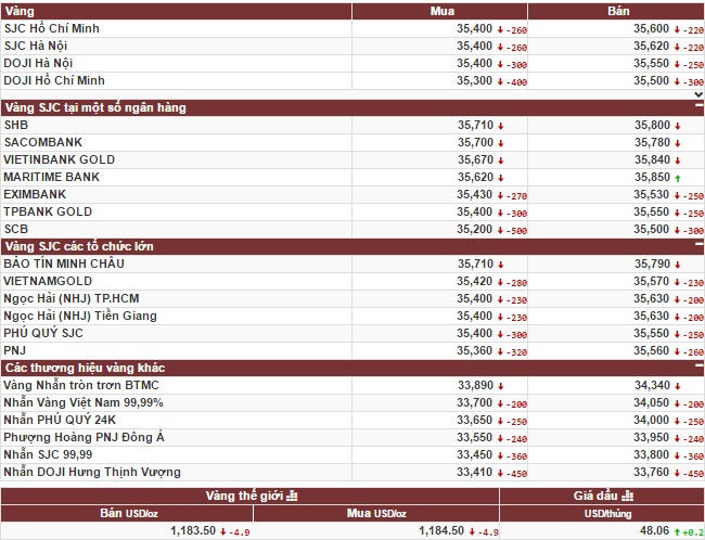 Cụ thể, tính tới cuối phiên giao dịch 23/11, Tập Đoàn Vàng bạc đá quý DOJI niêm yết giá vàng SJC ở mức: 35,70 triệu đồng/lượng (mua vào) và 35,80 triệu đồng/lượng (bán ra). Công ty vàng bạc đá quý Sài Gòn niêm yết vàng SJC ở mức: 35,66 triệu đồng/lượng (mua vào) và 35,84 triệu đồng/lượng (bán ra). Công ty vàng bạc Bảo Tín Minh Châu niêm yết giá vàng SJC niêm yết giá vàng ở mức: 35,71 triệu đồng/lượng (mua) và 35,79 triệu đồng/lượng (bán).