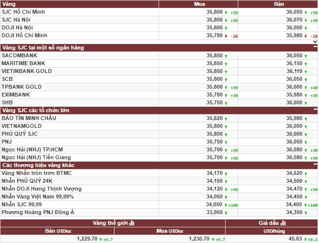Cụ thể, tính tới phiên giao dịch 16/11, Tập Đoàn Vàng bạc đá quý DOJI niêm yết giá vàng SJC ở mức: 35,80 triệu đồng/lượng (mua vào) và 36,00 triệu đồng/lượng (bán ra). Công ty vàng bạc đá quý Sài Gòn niêm yết vàng SJC ở mức: 35,78 triệu đồng/lượng (mua vào) và 35,98 triệu đồng/lượng (bán ra).