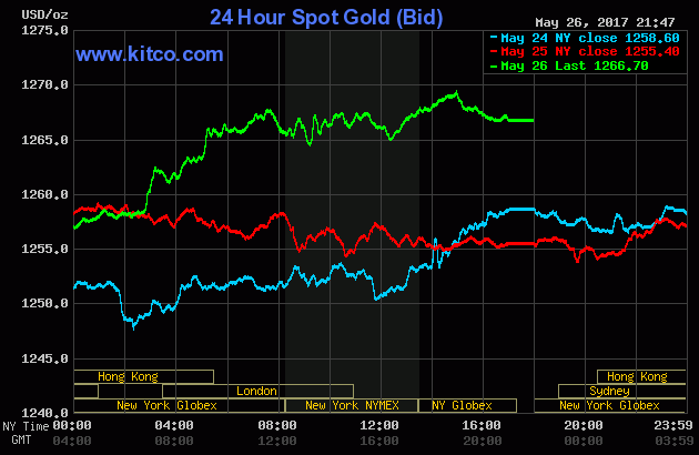 Theo đó, giá vàng giao tháng Sáu tăng 11,70 USD, tương đương 0,9%, lên 1.268,10 USD/ounce. Đây là mức đóng cửa cao nhất kể từ 28/4. Giá kim loại quý này đã tăng 1,2% trong tuần này.