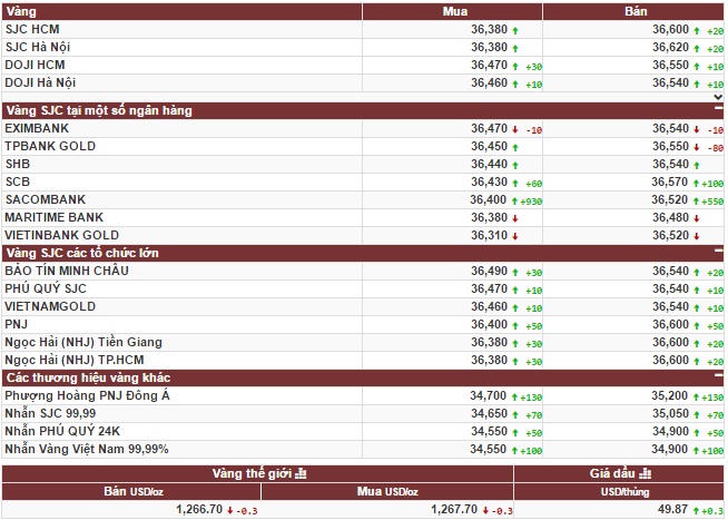 Trong khi đó, giá vàng miếng SJC tại công ty TNHH Vàng bạc đá quý Bảo Tín Minh Châu đang được niêm yết ở mức 36,49-36,55 triệu đồng/lượng, tăng 100 nghìn đồng/lượng ở mỗi chiều.