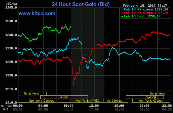 Tới đầu giờ sáng 17/2 (giờ Việt Nam), giá vàng thế giới giao ngay đứng ở mức 1.237,6 USD/ounce, tăng 4,4 USD so với phiên liền trước. Giá vàng giao tháng 4 trên sàn Comex New York tăng 5,4 USD lên 1.238,2 USD/ounce.