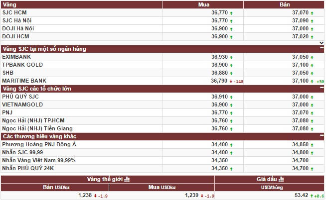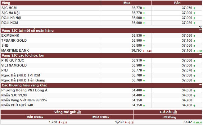 Trên thị trường vàng trong nước,giá vàng miếng được Tập Đoàn Vàng bạc đá quý DOJI niêm yết ở mức: 36,90 triệu đồng/lượng (mua vào) và 37,00 triệu đồng/lượng (bán ra), tăng 20 ngàn đồng chiều bán ra so với giá cuối phiên qua.