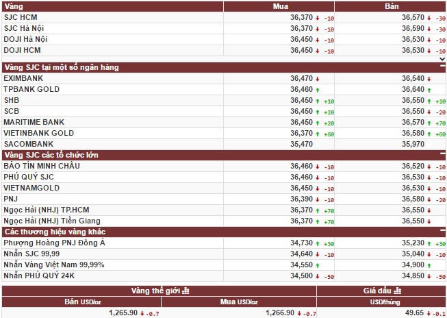Giá vàng miếng SJC một lượng của Công ty vàng bạc đá quý Sài Gòn niêm yết tại TP. Hồ Chí Minh ở mức 36.37 - 36.57 triệu đồng/lượng (chiều mua vào - bán ra). Giá vàng SJC tại TP. Hà Nội ở mức 36.37 -36.539triệu đồng/lượng (mua vào – bán ra).