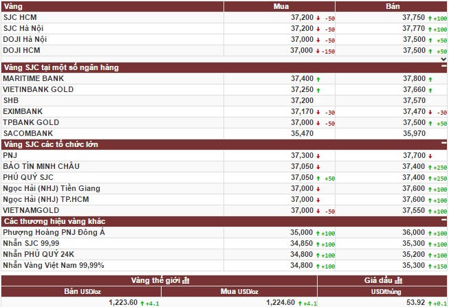 Tại Công ty SJC, giá vàng niêm yết chiều mua vào là 37,20 triệu đồng/lượng, ở chiều bán ra có mức giá là 37,72 triệu đồng/lượng. Tại thị trường TP.HCM, chiều bán ra niêm yết ở mức giá 37,70 triệu đồng/lượng.