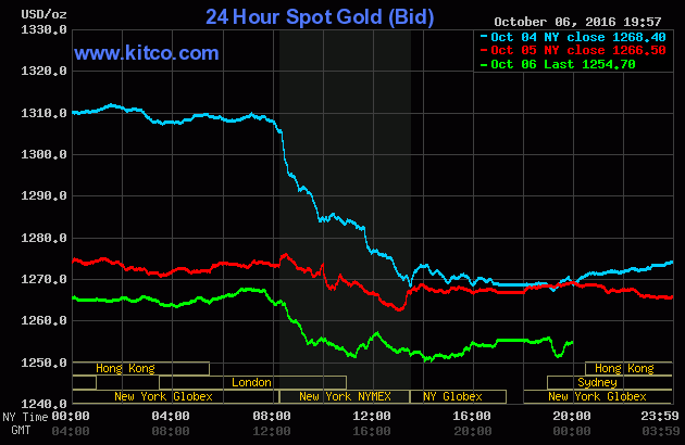 Sáng nay 7:00 theo giờ Việt Nam, giá vàng giao ngay trên sàn Kitco đứng tại 1.254,7USD/oz, giảm 0,9% so với chốt phiên trước.