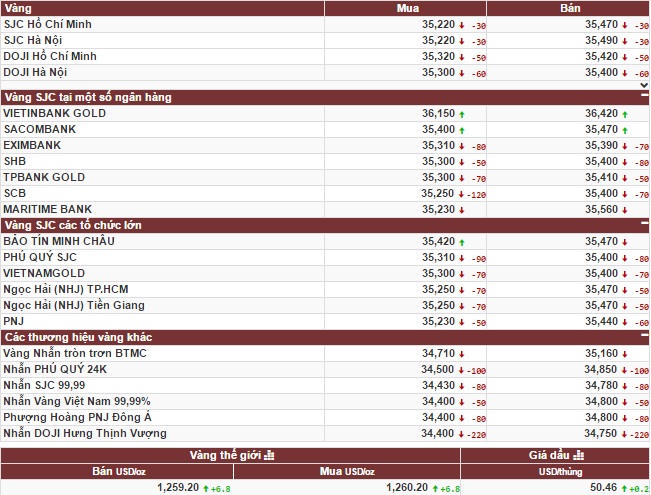 Công ty vàng bạc đá quý Sài Gòn niêm yết ở mức 35,19 triệu đồng/lượng (mua vào)và 35,46 triệu đồng/lượng (bán ra), giảm 60 ngàn đồng/lượng ở cả 2 chiều mua vào và bán ra so cuối giờ chiều 6/10.