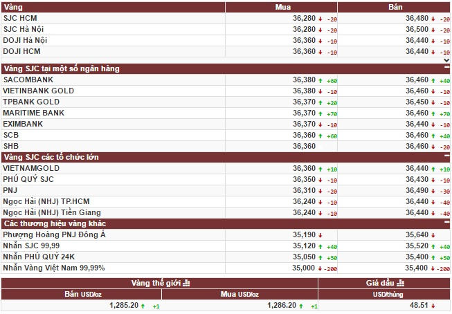 Tại Công ty SJC, giá vàng niêm yết chiều mua vào là 36,30 triệu đồng/lượng, ở chiều bán ra có mức giá là 36,52 triệu đồng/lượng. Tại thị trường TP.HCM, chiều bán ra niêm yết ở mức giá 36,50 triệu đồng/lượng.