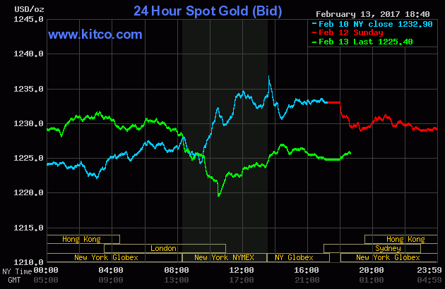 Sáng nay 7:00 theo giờ Việt Nam, giá vàng giao ngay trên sàn Kitco đứng tại 1.225,4USD/oz, giảm 0,6% so với chốt phiên trước. Hiện giá vàng cao hơn 6,5% (+75 USD/ounce) so với cuối năm 2016. Vàng thế giới quy đổi theo giá USD ngân hàng hiện có giá gần 33,9 triệu đồng/lượng, chưa tính thuế và phí, thấp hơn giá vàng trong nước hơn 3 triệu đồng/lượng.