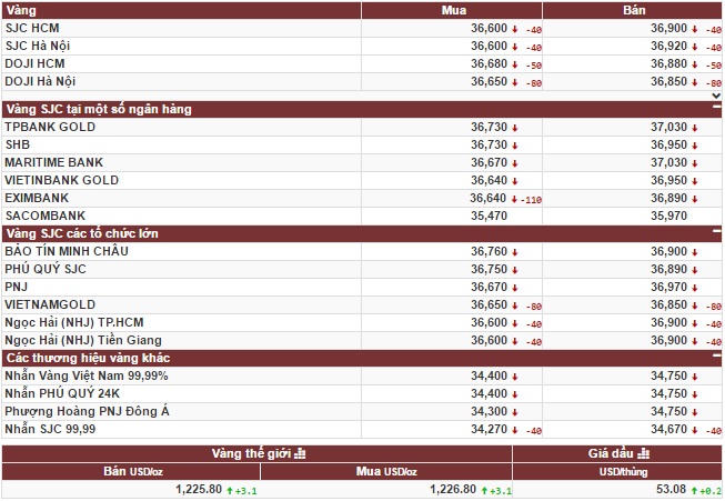 Trong khi đó, giá vàng của Tập đoàn Doji lẻ niêm yết tại khu vực Hà Nội niêm yết ở mức giá 36, 65 – 36, 85, cũng giảm 80.000 đồng/lượng so với chốt phiên của ngày hôm trước.