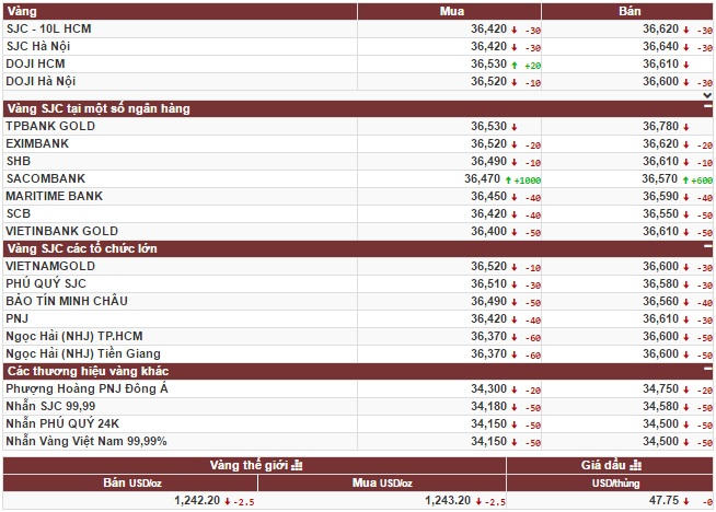 Tập đoàn DOJI niêm yết giá vàng sáng nay ở mức 36,48 – 36,58 triệu đồng/lượng (mua vào – bán ra). So với phiên trước, giá vàng giảm 60.000 đồng/lượng ở cả hai chiều mua – bán. Mức chênh lệch giá bán vẫn cao hơn giá mua 100.000 đồng/lượng.
