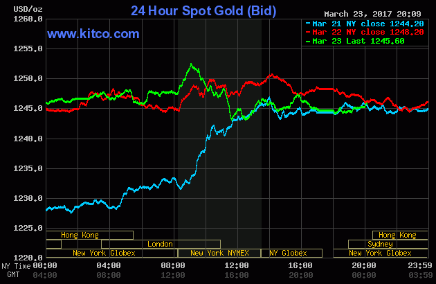 Chốt phiên giao dịch ngày thứ Năm trên thị trường New York, giá vàng giao tháng Tư giảm 2,50USD/ounce, tương đương 0,2% xuống 1.247,20USD/ounce. Phiên trước đó, giá vàng đóng cửa ở mức 1.249,70USD/ounce - mức chốt phiên cao nhất tính từ đầu tháng Ba năm nay. Hôm qua là phiên giao dịch cuối cùng của giá vàng kỳ hạn tháng Tư.