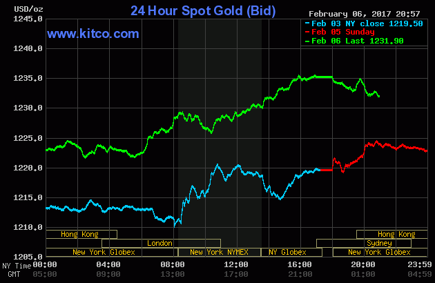 Sáng nay (theo giờ Việt Nam), giá vàng thế giới giao ngay đứng ở mức 1.233,1 USD/ounce, tăng 13,6 USD so với cùng giờ phiên liền trước. Giá vàng giao kỳ hạn tháng 4 trên sàn Comex New York tăng 11,3 USD/ounce lên 1.232,1 USD/ounce.
