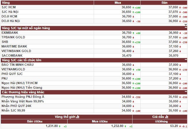 Mở cửa phiên sáng 7/2, giá vàng SJC tại Hà Nội được Tập đoàn DOJI công bố ở mức 36,65 - 36,95 triệu đồng/lượng, trong khi tại TP HCM giá vàng là 36,70 - 37,00, theo niêm yết của Công ty VBĐQ Sài Gòn.