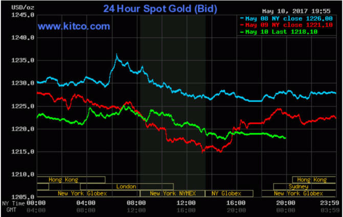 Tới đầu giờ sáng 11/5 (giờ Việt Nam), giá vàng thế giới giao ngay tăng khoảng 2 USD lên 1.223,2 USD/ounce. Giá vàng giao tháng 6 trên sàn Comex New York tăng 6,1 USD lên 1.222,1 USD/ounce.
