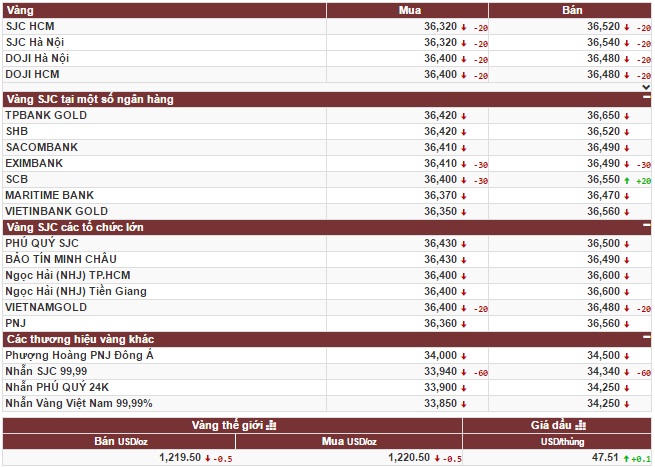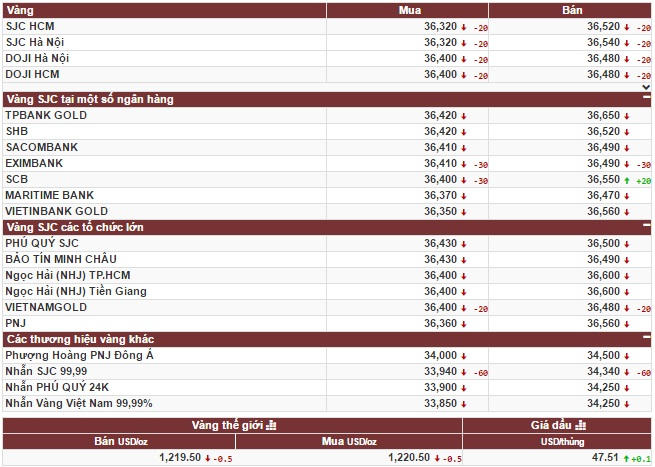 Trong khi đó, giá vàng của Tập đoàn Doji lẻ tại khu vực Hà Nội niêm yết ở mức giá 36,420 – 36,500 triệu đồng/lượng (mua vào – bán ra), cũng giảm 50.000 đồng/lượng ở chiều mua vào và giữ nguyên mức giá ở chiều bán ra so với chốt phiên của ngày hôm trước.