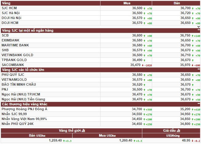 Công ty vàng bạc đá quý Sài Gòn niêm yết giá vàng SJC ở mức 36,52 triệu đồng/lượng (mua vào) và 36,74 triệu đồng/lượng (bán ra), tăng 90 ngàn đồng chiều mua vào và bán ra so với cuối giờ chiều ngày 17/5.