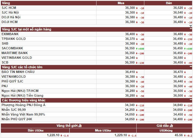 Trong khi đó, giá vàng của Tập đoàn Doji lẻ tại khu vực Hà Nội niêm yết ở mức giá 36,410 – 36, 490 triệu đồng/lượng (mua vào – bán ra), cũng giảm 170.000 đồng/lượng so với chốt phiên của ngày hôm trước.