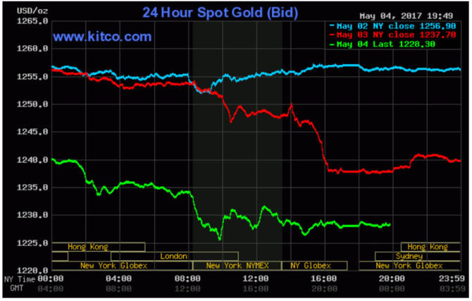Ở thời điểm cập nhật lúc 6h50 sáng theo giờ Việt Nam, giá vàng giao ngay đang ở mức 1.228,30 USD/ounce, giảm so với mức chốt phiên hôm thứ Tư là 1.237,70 USD/ounce.