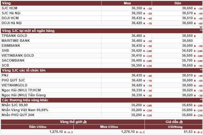 Trong khi đó, giá vàng miếng thương hiệu Vàng rồng Thăng Long tại công ty này đang được niêm yết ở mức 35,38 – 35,83 triệu đồng/lượng, giảm 50 nghìn đồng/lượng ở mỗi chiều.