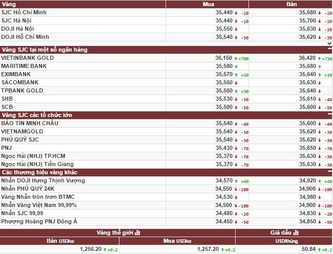 Công ty vàng bạc đá quý Sài Gòn niêm yết ở mức 35,40 triệu đồng/lượng (mua vào) và 35,66 triệu đồng/lượng (bán ra), giảm 50 ngàn đồng/lượng chiều mua vào và giảm 60 ngàn đồng bán ra so cuối giờ chiều 11/10.