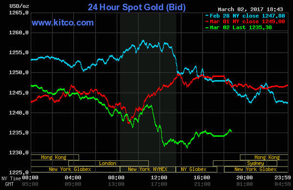 Tác động tới giá vàng trong nước sáng nay là diễn biến của giá vàng thế giới đêm qua theo giờ Việt Nam. Giá kim loại quý tiếp tục giảm mạnh từ ngưỡng trên 1.245 USD/ounce xuống dưới ngưỡng 1.235 USD/ounce.